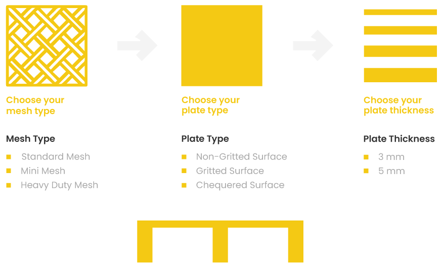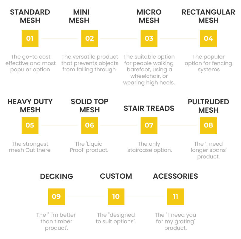 Standard Mesh Grating, Mini Mesh Grating, Micro Mesh Grating, Solid Top Grating, Heavy Duty Grating, Stair treads, Pultruded Grating, FRP Decking