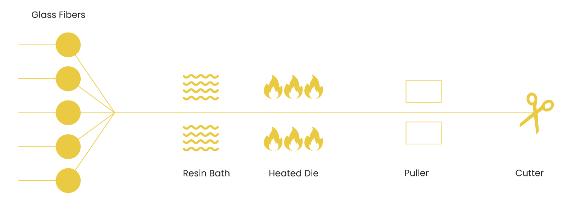 The process comprises drawing composite materials, such as fiberglass, through a die to fashion a preferred shape. The materials are impregnated with resin and then pulled through a heated die where the resin solidifies and cures into the final form.
