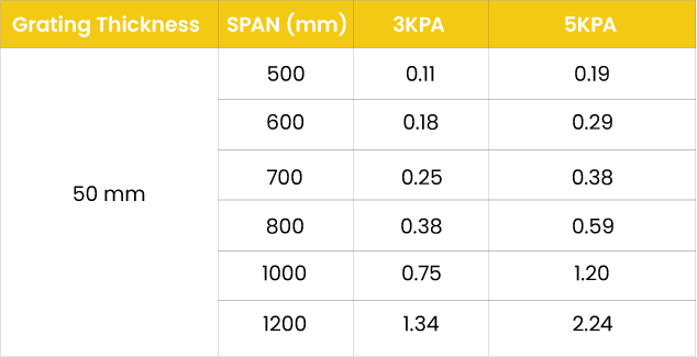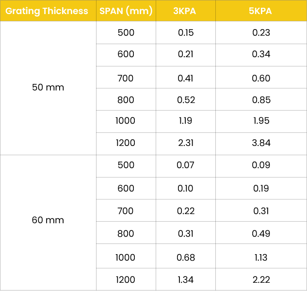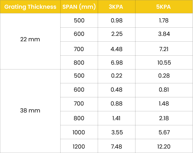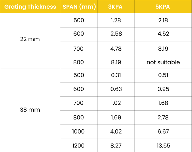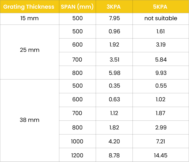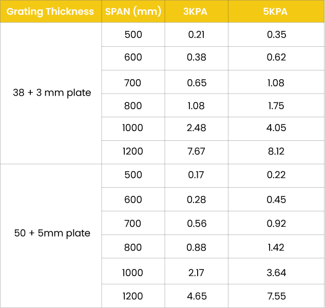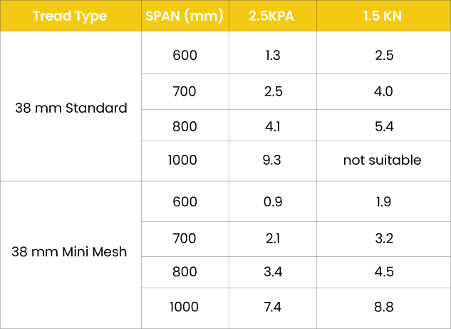 Please keep in mind that all values in the table are in mm for deflection and are indicative only. This table provides loads for top solid gratings with standard mesh type.