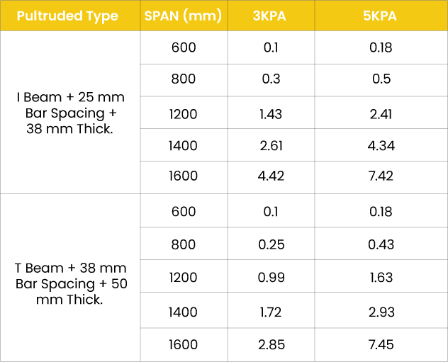 Please note all values provided in table are in mm for deflection. These are indicative only. All information provided in this table is based on a standard 152 mm maximum rod spacing between pultruded bars. Deflection for intermediate spans may be determined by interpolation methods.
