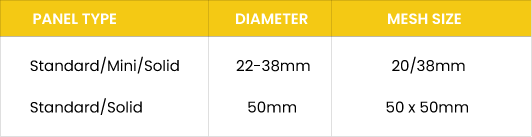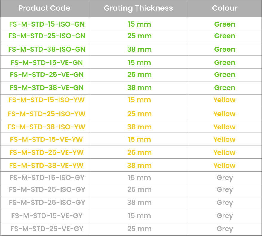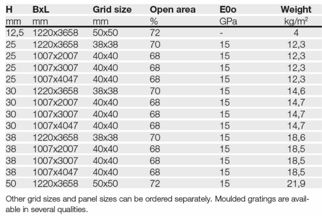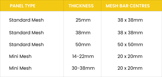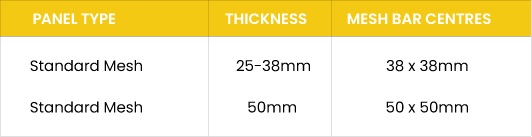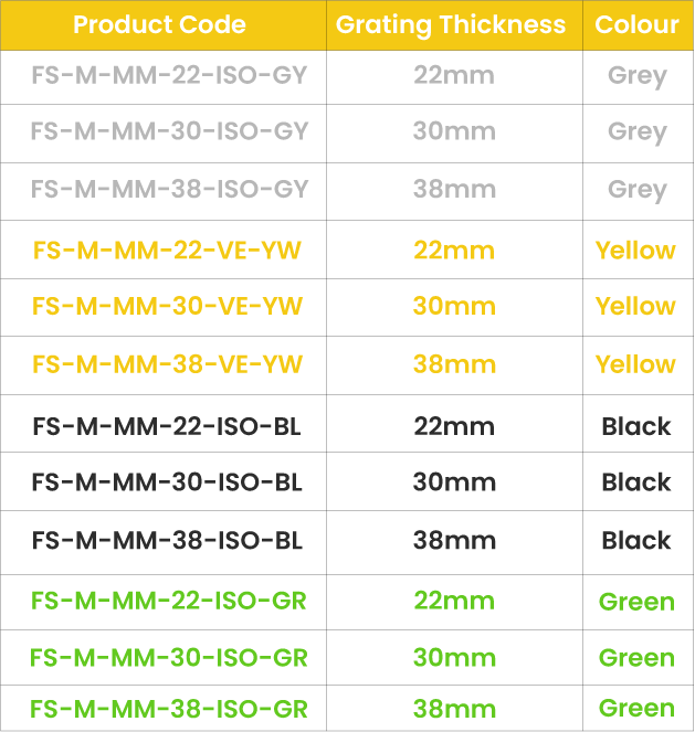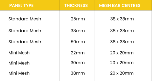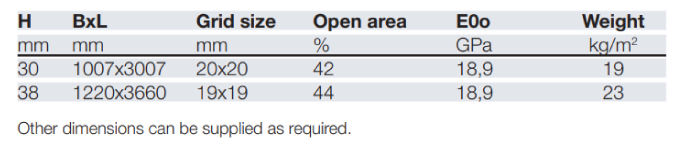 Our product line features a range of grating options that come in different colours, thicknesses, and resins. We offer our standard mesh grating panels in various standard sizes, with the most popular size being 1220 x 3660 mm, with a mesh size of 38 x 38 mm, and a hole opening of 31 x 31 mm.